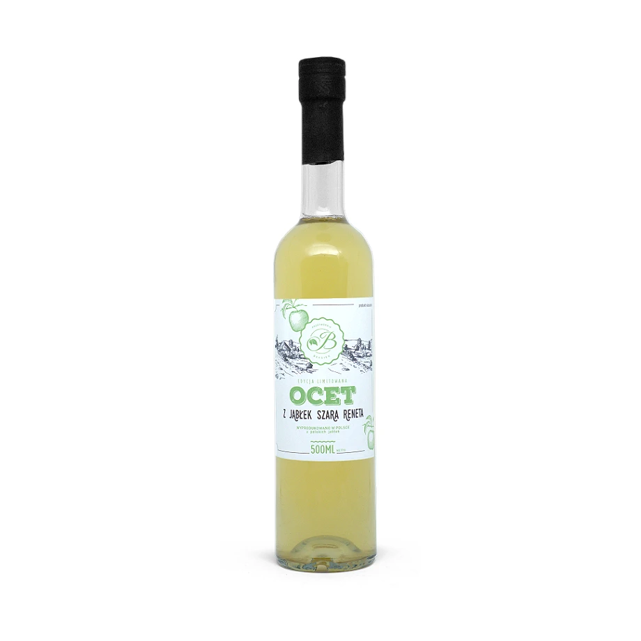 Ocet jabłkowy - Naturalny, żywy ocet z najlepszej odmiany jabłek, polskiej szarej renety której owoce poddajemy naturalnemu procesowi fermentacji, bez dodatku drożdży. Do produkcji używamy owoców zdrowych i dojrzałych, pochodzących głównie z naszego sadu oraz od zaprzyjaźnionych sadowników z południa naszego kraju. Fermentacja alkoholowa przy otwartym procesie produkcji i stałym natlenieniu dzięki bakteriom z rodziny Acetobacteraceae postępuje w cichą fermentację octową. Powolny proces trwa od kilku do kilkunastu tygodni. Po zakończonej fermentacji octowej ocet dojrzewa od trzech do dwunastu miesięcy.